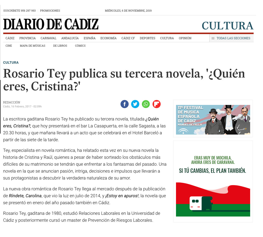 Una vez más, desde estas líneas quiero transmitir mi más sincero agradecimiento al Diario de Cádiz por hacerse eco a través de su edición digital de la publicación de mi 3ª novela, “¿Quién eres, Cristina?”.
