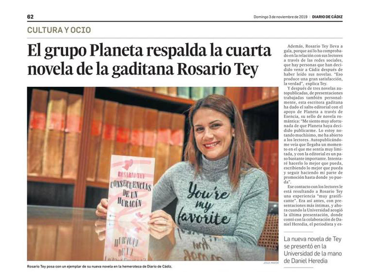 Consecuencias de un huracán es la cuarta obra de esta escritora gaditana de literatura romántica que, en esta ocasión, ha encontrado el respaldo de Esencia, el sello para el género rosa del grupo Planeta. La novela, que se ha presentado hace unos días en la Universidad de Cádiz, está ambientada en la capital gaditana como las anteriores obras de la autora, y es, en palabras de Rosario Tey “una comedia romántica”.
